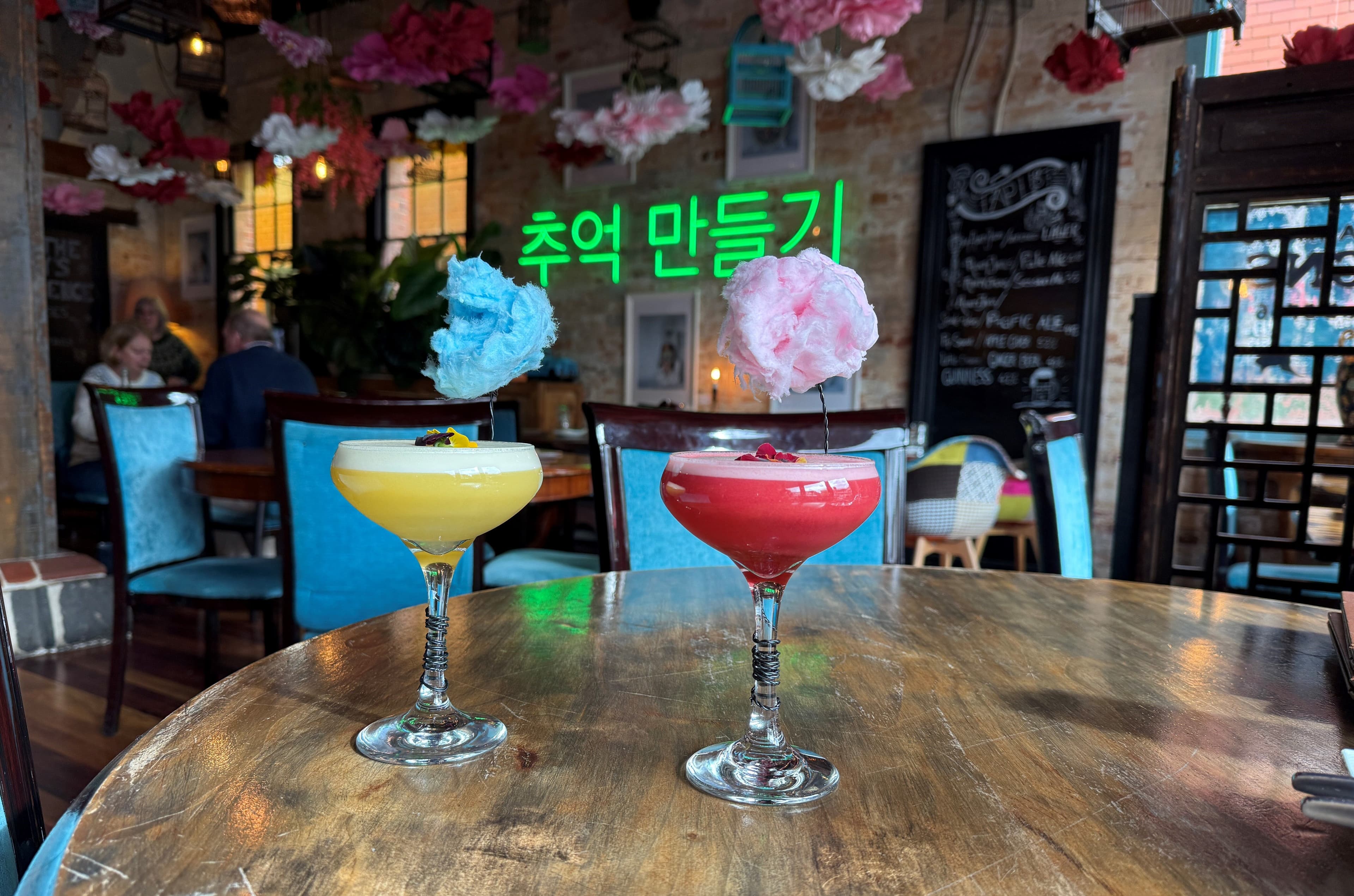 The Sunset Cloudburst (the delight on the right) brings together Grainery Lane strawberry gin, strawberry puree, cranberry juice, lime juice and egg whites.