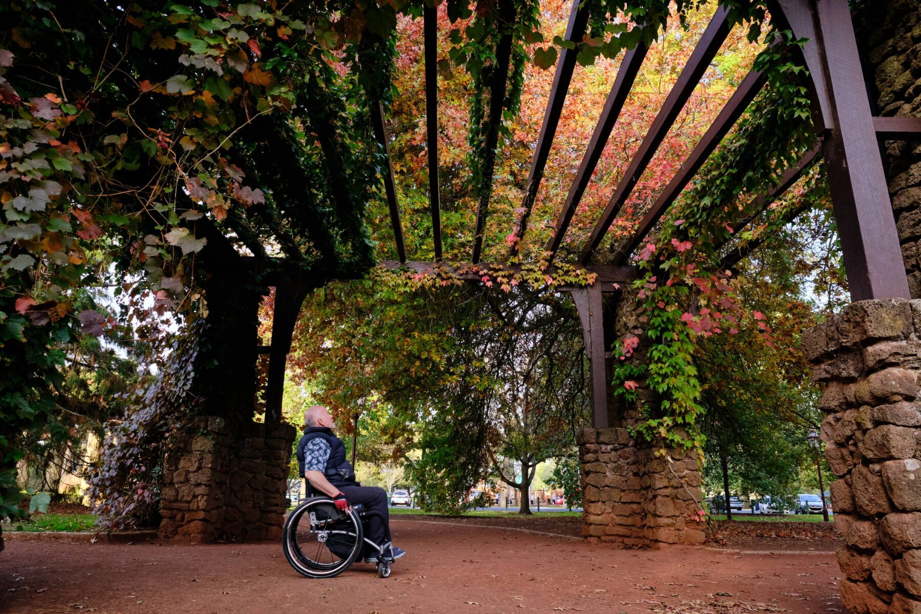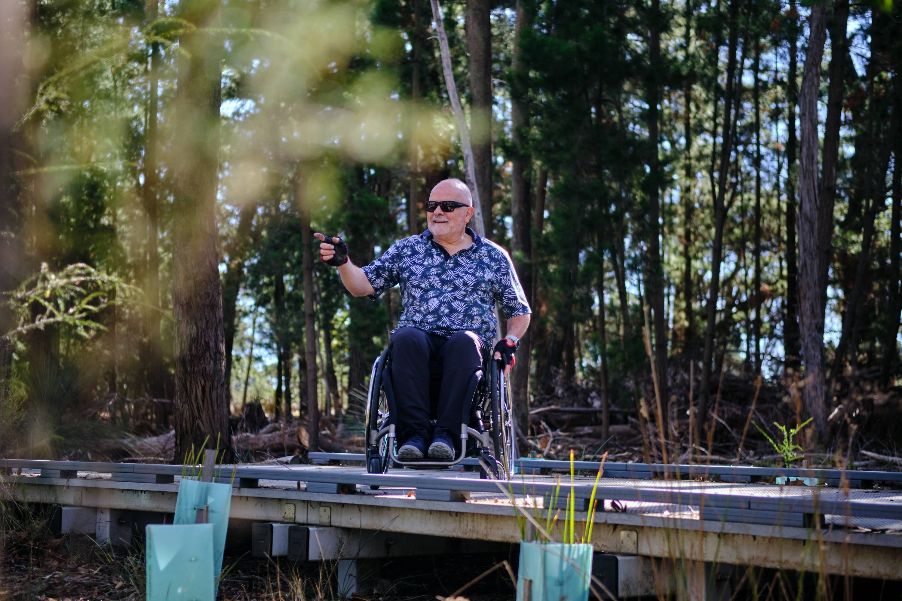 Full to the brim, we headed out onto the Steve Moneghetti Track, a 6km accessible track that completes a full lap of Lake Wendouree. Gerard loved the well-packed gravel paths, which made it easy for him to self-propel (which he prefers over being pushed). He was even able to go ‘off-road’ a bunch of times to check out flowers and sculptures.
